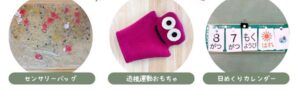 ひんやり冷たい感触遊びに使えるセンサリーバッグ、赤ちゃん期から追視運動にも使えるパペットと、モンテクラスでも使っている日めくりカレンダーを作りました。